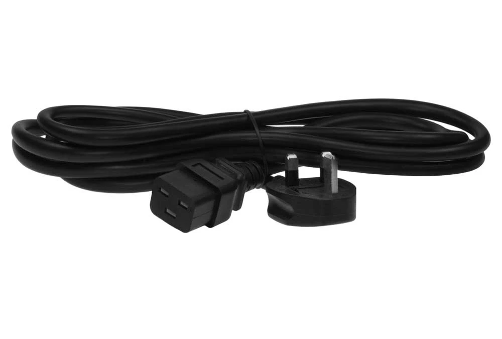 UK to C19 power cord. BS1363 standard UK fused 3 pin plug to IEC C19 with H05VV-F 1.5mm_ black wire. 10 feet. Rated up to 13A 250V. It carries the following approvals: British ASTA; Singapore PSB; Hong Kong HKSI and Saudi Arabia SASO. This power cord is also known as the BS1363 to IEC C19 mains power lead or BS 1363 to C19 mains cable.