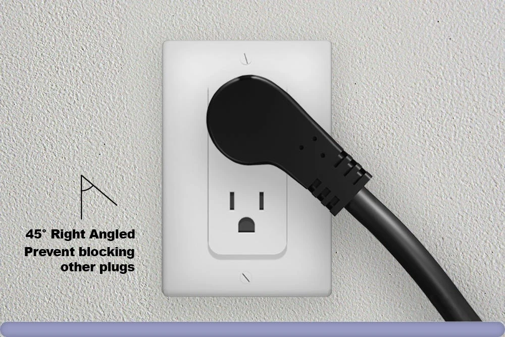 - 45° angled 3-prong connector prevents blocking outlet space for other power connection