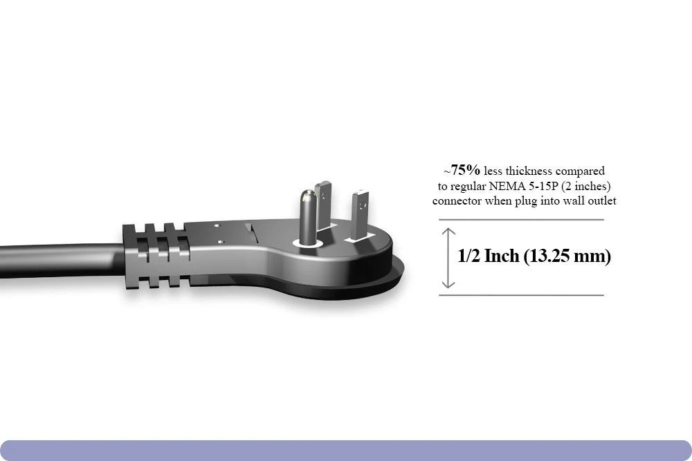 - Perfect design for indoor use in tight space, space-saving flat NEMA 5-15P connector