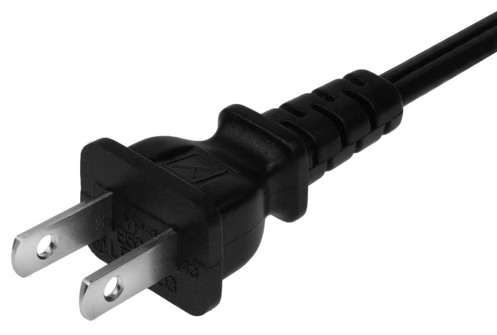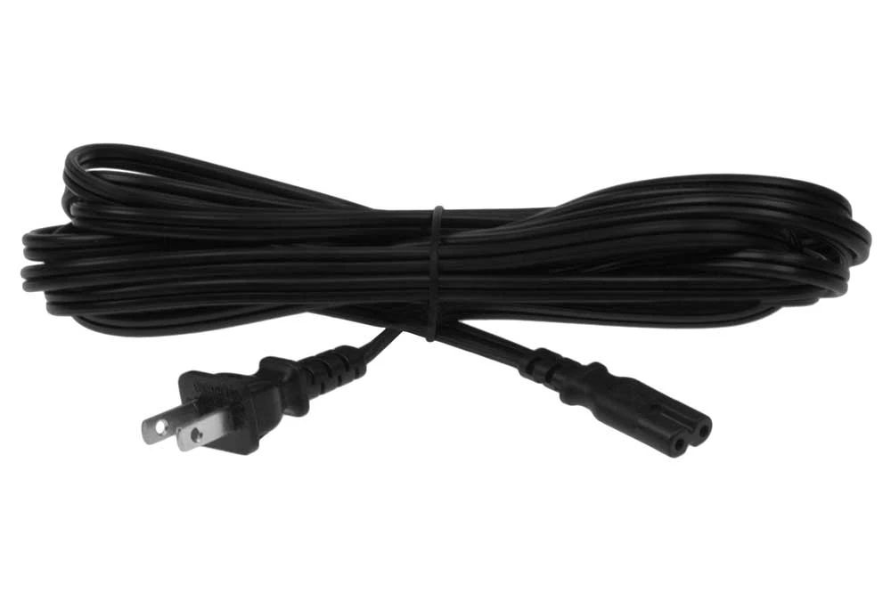 - USA to C7 power cord: NEMA 1-15P standard USA 2 pin plug to IEC C7 figure 8 receptacle with 18/2 SPT-2 black wire power cord.
