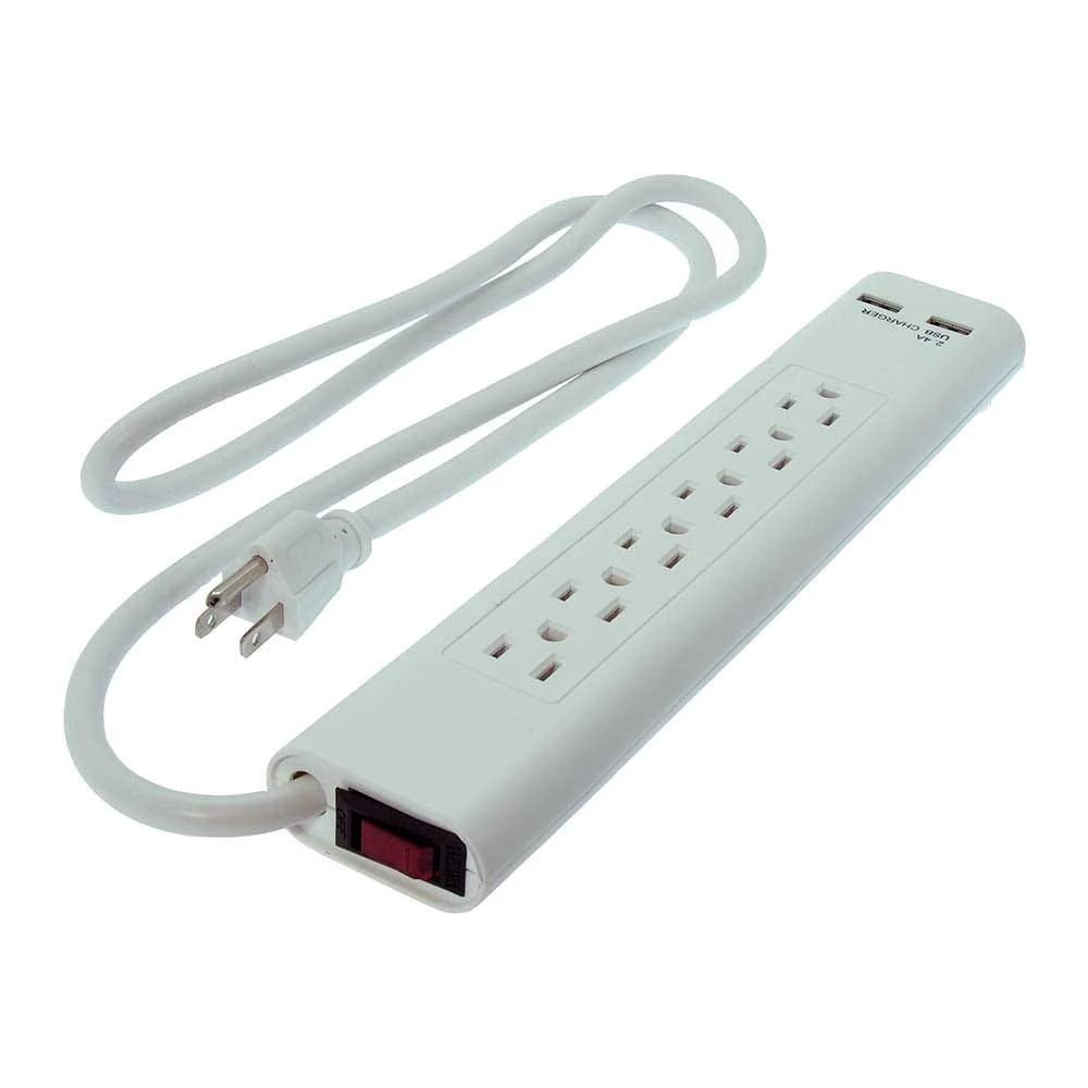 This power strip surge protector provides 6 outlets and 2 USB charging ports (5V, 2.4A) for power supply and helps protect home and office electronic appliances from damage caused by power surges.