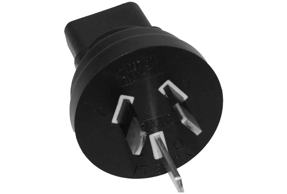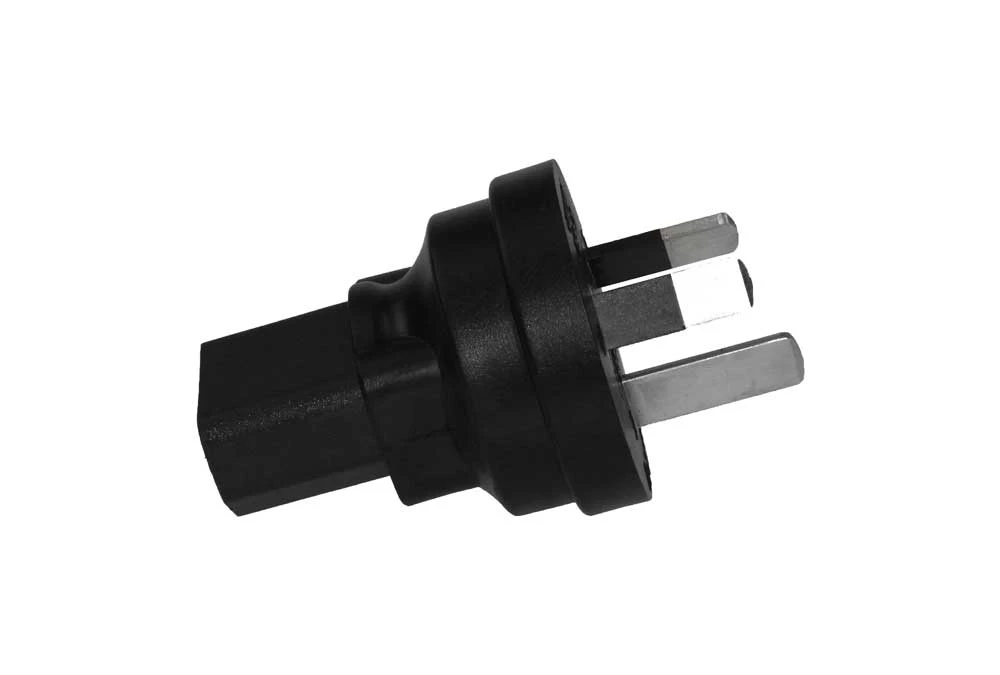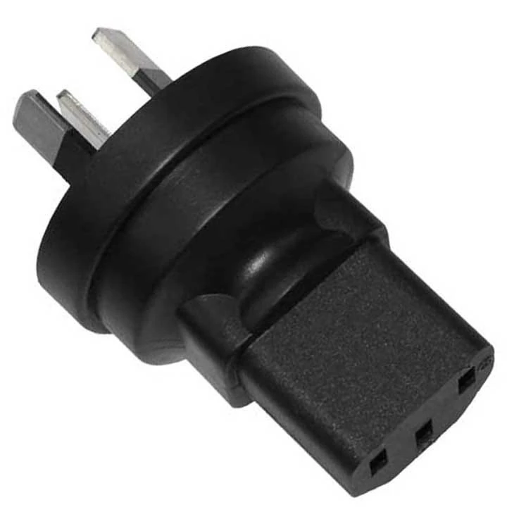 Australia to C13 Plug Adapter: SAA certified Australia AS3112 plug to IEC C13 receptacle plug adapter. Rated up to 10A 250V. With rugged molded construction, these IEC C13 to Australia three prong plug adapters are RoHS and REACH certified.