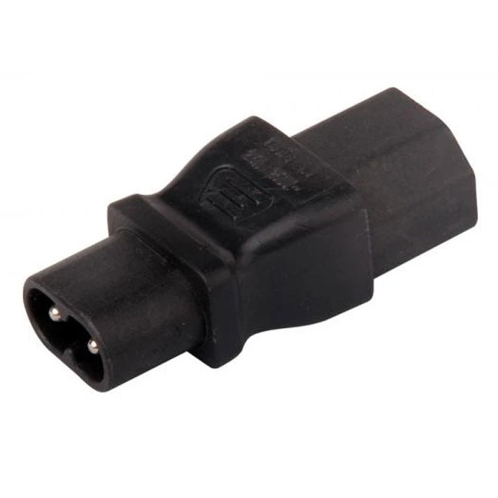 C8 to C13 Plug Adapter: IEC C8 two prong plug to IEC C13 three prong receptacle plug adapter. Rated up to 10A 125V. Rugged molded construction.