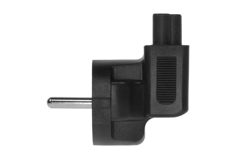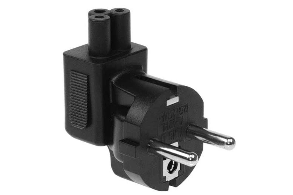 - European CEE7/7 Schuko plug to IEC C5 receptacle right angle plug adapter.