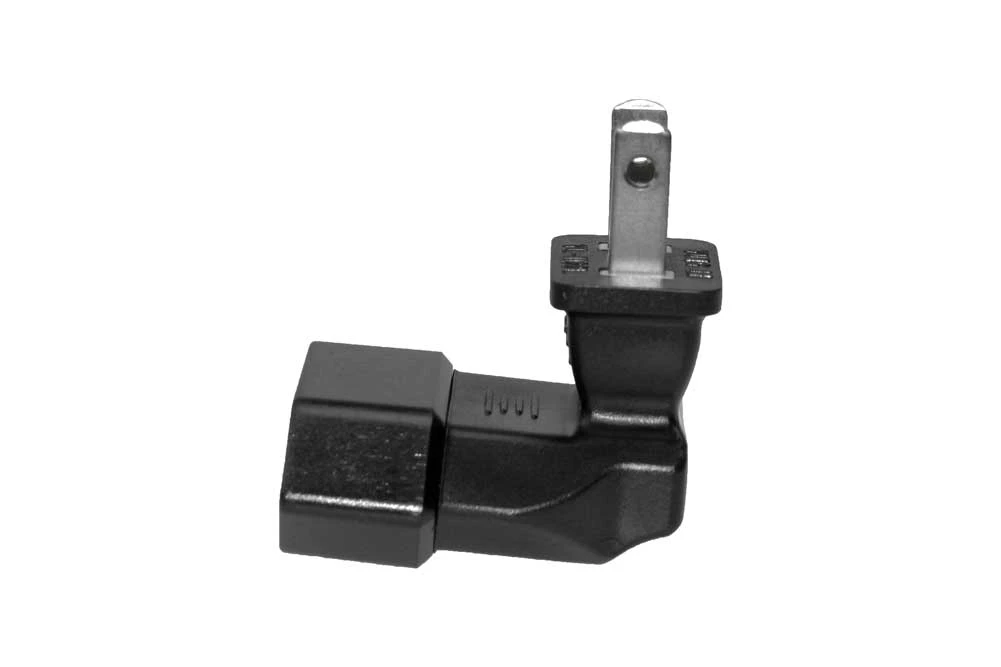 Europe 2P to USA 2P angled Plug Adapter: USA NEMA 1-15P plug to right angle Europe CEE7/16 receptacle plug adapter. Rated up to 3A 125V. cUL approved.