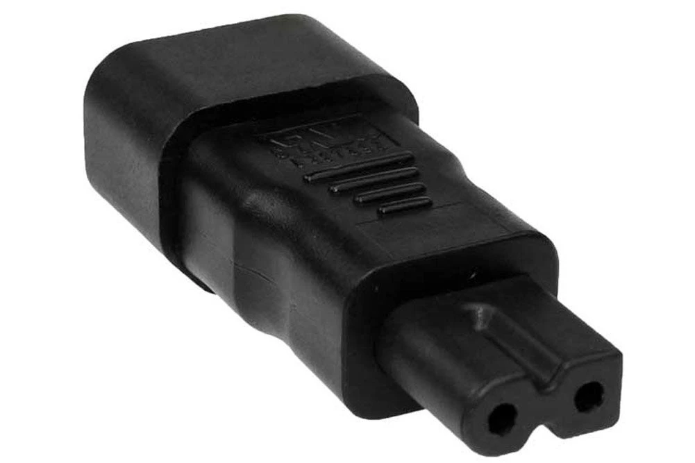 on one side) IEC C7 two prong receptacle plug adapter. - Rated up to 10A 125V.
