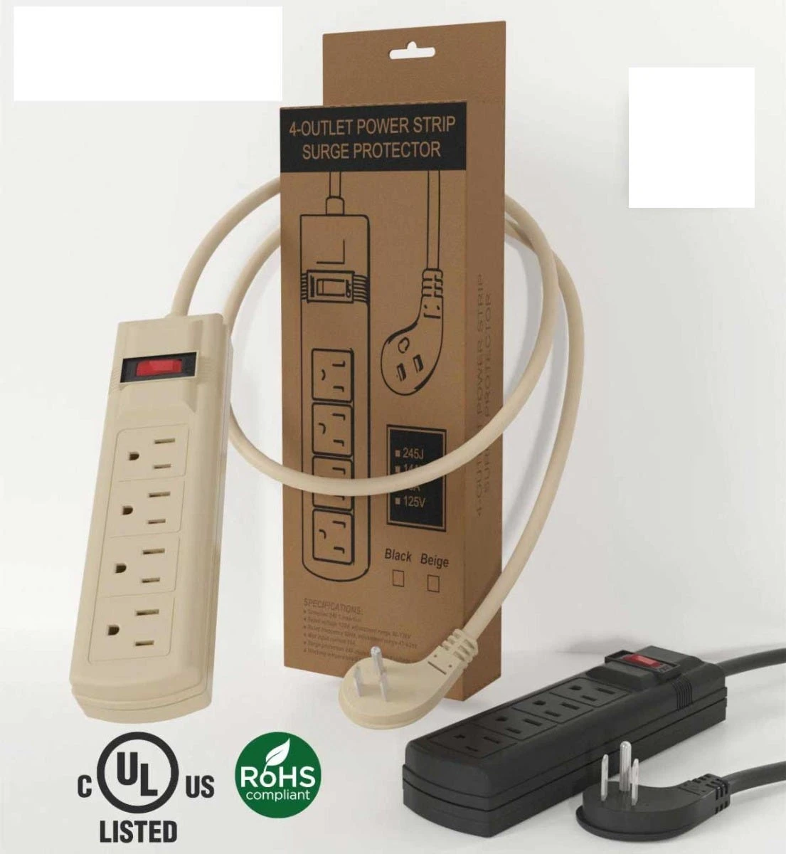 This Specification is suitable for insertion in 2401. Equipped with a one-line surge suppressor for reliable protection. Offers surge protection at 245J, 1pc 14D331 protector. Overcurrent protection max 15A, and voltage limit up to 800V. Connected with the sturdy 14 AWG power cord.