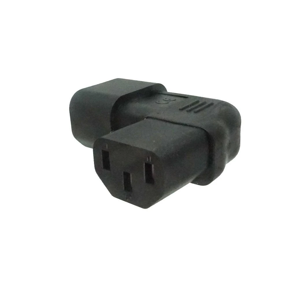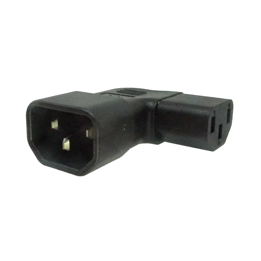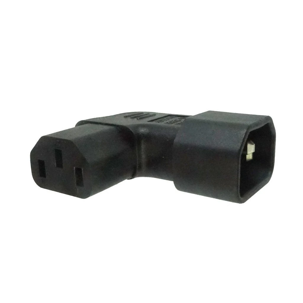 Right Angle C13 to C14 Plug Adapter: Right Angle IEC C13 receptacle to IEC C14 plug gender changer or plug adapter. Rated up to 15A 250V. Rugged molded construction with CE approval.