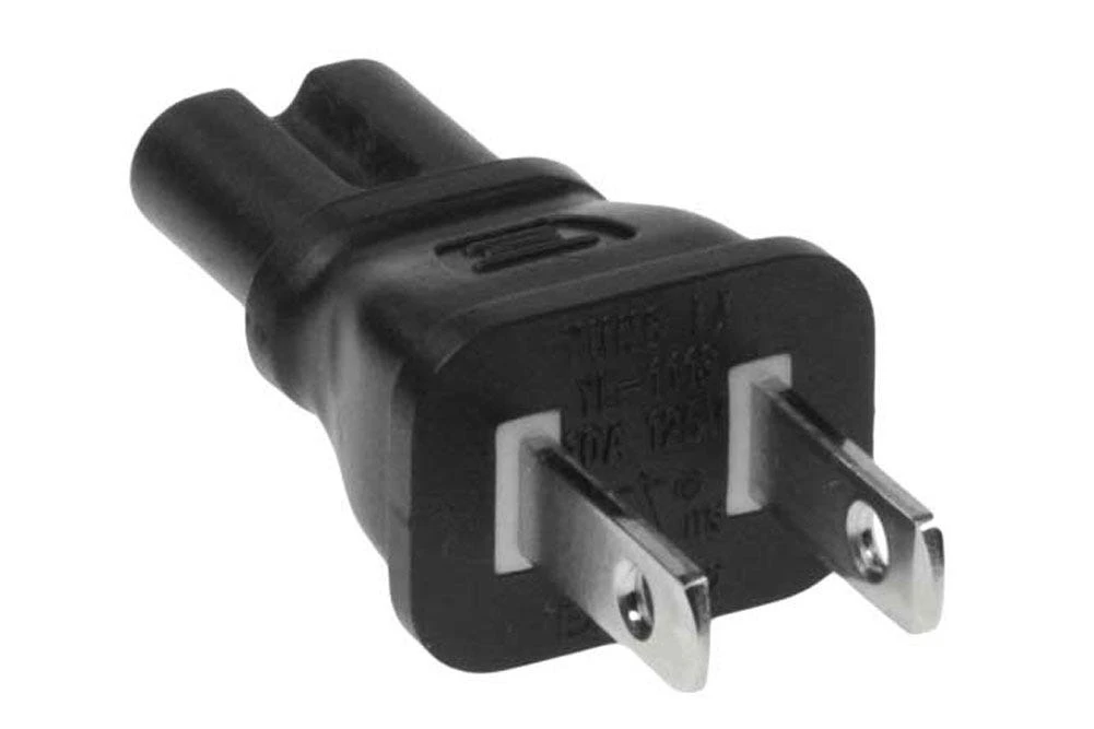 - 2 prong plug adaptor. USA IEC 60320-C7 2 prong receptacle to USA NEMA 1-15P 2 prong plug.