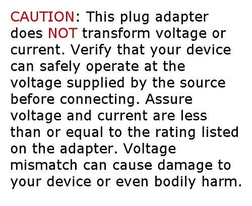 CAUTION: This plug adapter does NOT transform voltage or current. Verify that your device can safely operate at the voltage supplied by the source before connecting. Assure voltage and current are less than or equal to the rating listed on the adapter. Voltage mismatch can cause damage to your device or even bodily harm.